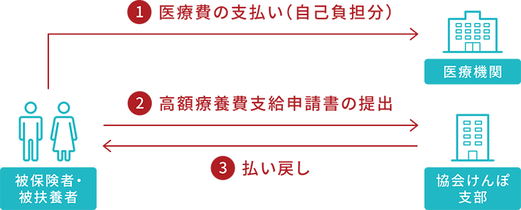払い戻しは、医療機関等から提出される診療報酬明細書(レセプト)の審査を経て行いますので、診療月から3ヵ月以上かかります。払い戻しまで時間を要するため、医療費の支払いに充てる資金として、高額療養費支給見込額の8割相当額を無利子で貸付する「高額医療費貸付制度」もあります。詳しくは協会けんぽ支部までお問い合せください。
