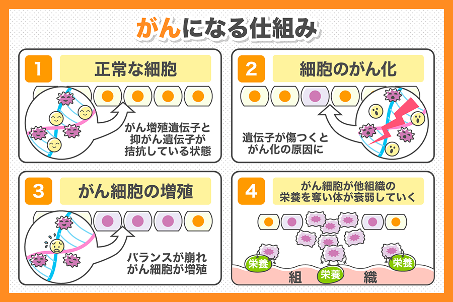 細胞が分裂するときに、ごくまれに起こる“エラー(遺伝子の傷)”が積み重なって発生することが多く、誰にでも起こり得る現象です。健康に気をつけている人でも癌になる可能性があるのはこのためです。